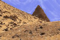 Graafveld in Soedan met een intacte piramide op de achtergrond en de overblijfselen van vernielde piramides aan de voorkant