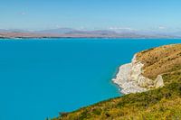 Het extreem blauwe water van het Pukaki gletsjer meer. Het water van de dit meer is afkomstig van de gletsjers bij Mount Cook.