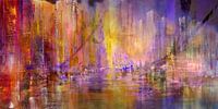 een grote levendige stad met een hangbrug, wolkenkrabbers en een bruisend leven. Kleurrijke structuren, een abstract geschilderd straatbeeld.
