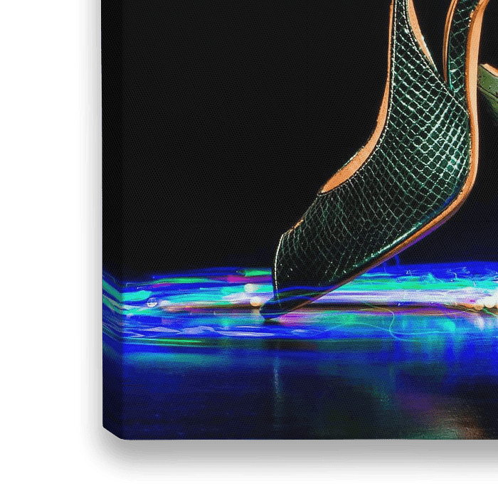 Naaldhakken met discokleuren. Hoe tof is dit beeld. Door middel van lightpainting is deze kunstzinnige foto gemaakt. Schilderen met licht doe je door een combinatie van een lange sluitertijd, flitslicht en gekleurd continue licht te werken. Lekker veel kleur en contrast zie je in deze foto. Door de donkere achtergrond wordt het een artistiek beeld. Deze afbeelding kan je werkelijk overal hangen. In de woonkamer, keuken, slaapkamer, hal maar ook in een horeca gelegenheid zal dit beeld onwijs gaaf zijn. Zeker als je kiest voor hooglans materiaal in een grote afmeting. Stiletto shoes in disco colours. This is art. The picture had a lot of colours and contrast. This picture is made with a lightpainting technique. By using flashlight, coloured light, some movement and a long shutterspeed I created this picture. It has a dark background. This print will look amazing in a high gloss material and a big size. Place it in the living, bedroom, restaurant or bar.