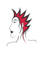 De vrouw heeft een rood kort punkkapsel met zwarte accenten.