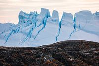 Puntige ijsschotsen komen tevoorschijn achter de grijze en bruine rotsen van Disko Bay in Groenland. Rotsformaties en grote ijsbergen zijn kenmerkend voor deze baai. De breuklijnen zijn goed zichtbaar in het ijs.
