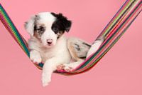 Schattig border collie puppy in een kleurrijke hangmat, tegen een roze achtergrond