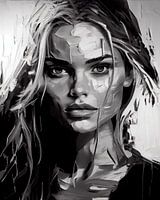 Zwartwit afbeelding van een portret van een prachtige vrouw. Acrylverf en palletmes zorgen voor een robuust en toch ook verfijnd geheel. Indringende blik vol emotie. Passend bij diverse stijlen en trends.