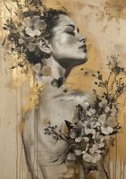 Prachtige vrouw omhuld in bloemen en planten. Opgebouwd uit diverse lagen. Kleurgebruik is zwartwit, grijs, goud, beige en wit. Ragfijne dunne zwarte draden, overeenkomstige met de zwarte abstracte takken complementeren het geheel. Passend bij diverse stijlen en trends.