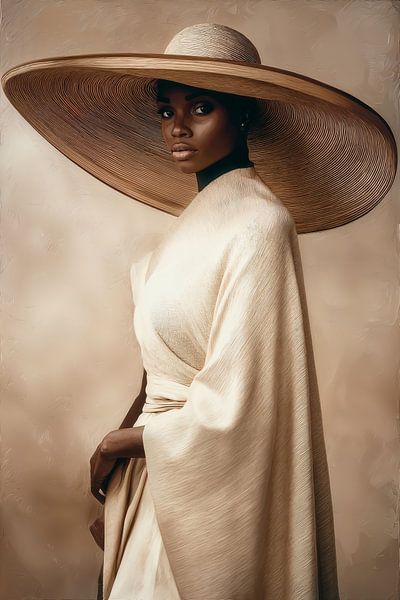 Een portret van verfijnde elegantie waarin een vrouw in een crèmekleurig gewaad onder een imposante strohoed naar binnen kijkt. Het kunstwerk balanceert soepel tussen klassieke schoonheid en moderne zelfbewustheid, met rijke texturen in wittinten en aarde die tegen een warme, neutrale achtergrond contrastreren. De oversized hat wordt…