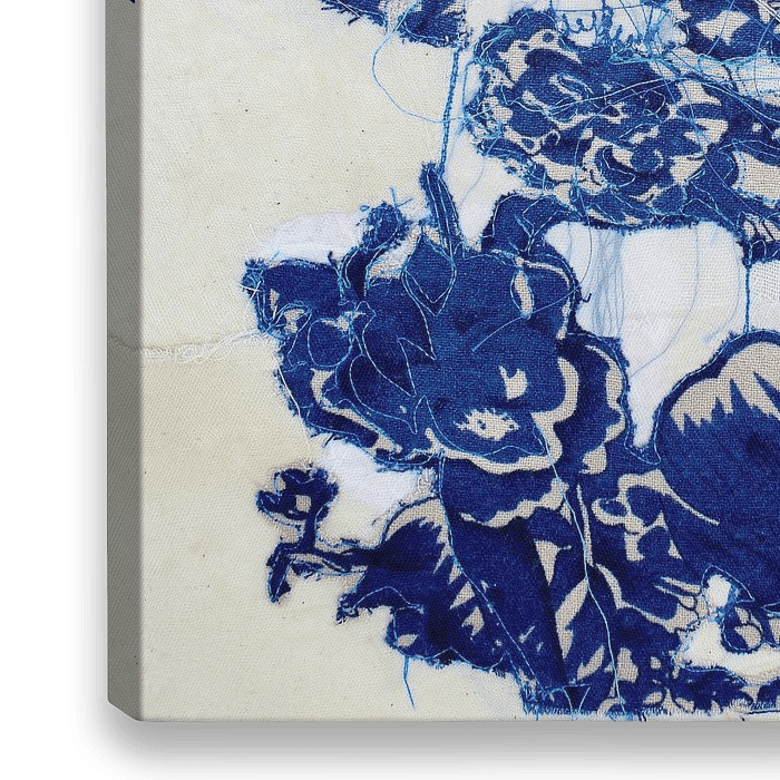 Een figuratief werk van blauw draad ,papier en textiel.