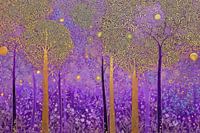 Fluisterende purperen stammen in een dans van gouden spiralen.