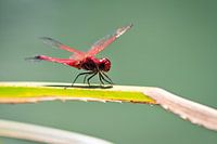Prachtige fel rood gekleurde purperlibel (korenbout) in een oase in Isalo, Madagaskar, met een mooie rustige achtergrond