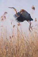Een purperreiger stijgt op uit het riet. Het rietlandschap is nog verborgen in de ochtendnevel, maar de eerste zonnestralen bereiken de stijgende reiger.