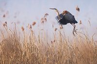 Een purperreiger stijgt op uit het riet. Het rietlandschap is nog verborgen in de ochtendmist, maar de eerste zonnestralen bereiken de stijgende reiger.