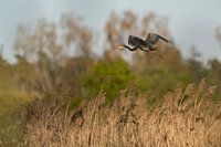 Een purperreiger vliegt over de rietkraag in het laagland van Wagbach bij Waghäusel in Baden-Württemberg.
