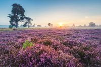 Het Leersumse veld kleurt weer prachtig paars. Bij de opkomende zon krijgt de paarse heide nog meer kleur. De Oranje gloed in de achtergrond maakt het plaatje helemaal compleet. Een mooi weids uitzicht met prachtige kleuren met de sfeervolle toevoeging van de mist.