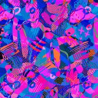 Een patroon met opvallende levendige tinten en een mix van texturen voor extra visuele interesse in een abstracte collage stijl. De achtergrond is gevuld met verspreide vormen, symbolen en patronen die een gevoel van energie oproepen.