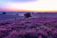 Vroege ochtendopname van de paarse heide op de Posbank omgeven in lichte ochtendmist.