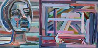 Collage van 2 schilderijen met lijnen in paars.