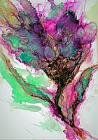 Paars en gouden bloem geschilderd met alcoholinkt. De kleuren lopen door elkaar en geven een wazig beeld. Alcohol inkt gaat zijn eigen weg en je weet nooit wat het resultaat zal zijn, altijd spannend en afwachten.