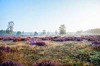 Foto van de heide in Uden bij zonsopkomst. Met nog een flardje mist boven de grond kleurt de heide langzaam paars. Een mooi weids uitzicht met heidestruiken op de voorgrond en de bomen van het omringende bos op de achtergrond.