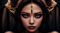 Prachtig A.I. portret van een vrouw met een intense blik en fel gekleurde make up. Rond haar hoofd een gouden kroon met donker paarse rozen.