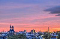 Een avondlucht in vijftig tinten paars boven het Oude Westen in Rotterdam, met links de twee torens van de Paradijskerk aan de Nieuwe Binneweg. Wat verder op de achtergrond zijn ook kranen en schoorstenen in het havengebied zichtbaar.