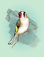 Een aquareltekening van een puttertje. Het vogeltje (ook wel distelvink genoemd) zit op een schuine tak. De achtergrond is groenig met een speelse aquarelvlek achter de vogel.