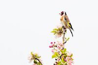 Putter in roze bloesem van appelboom in het voorjaar tegen witte achtergrond. High key opname van lente beeld met vogel in top van boom als Japanse kunt.