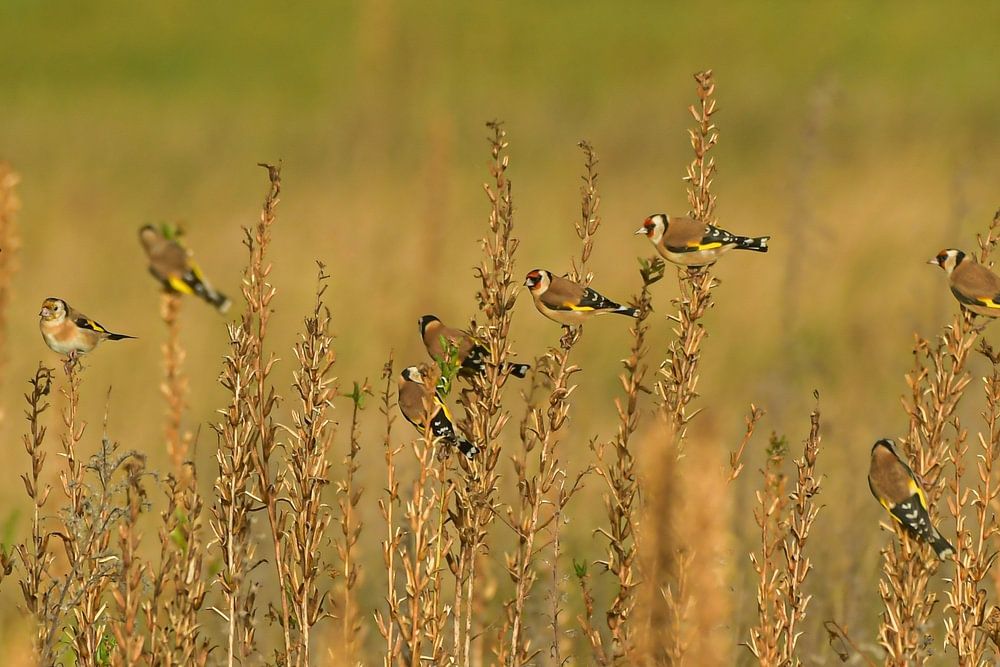 Een grote groep putters verblijft in het Noordhollands duinreservaat en doet zich tegoed aan de zaden in het prachtige herfstlicht.