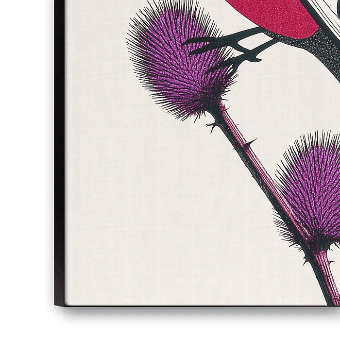 De compositie bestaat uit een puttertje met levendige kleuren die op een paarse distel zit, wat een gedurfd en eigentijds beeld creëert. Als canvasprint is dit werk ideaal voor liefhebbers van minimalistische dierenkunst en moderne wanddecoratie.