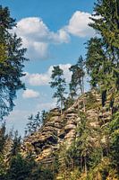 Genomen in hoogzomer in de vrije natuur in het Nationaal Park tussen rotsen en zandstenen en de Lichtenhain waterval.