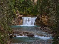 Zicht op een waterval in de populaire Johnston Canyon in Banff National Park, Alberta, Canada in de Rocky Mountains in de herfst met blauwachtig glinsterend water en rotsachtige rivierbedding omgeven door dicht naaldbos.