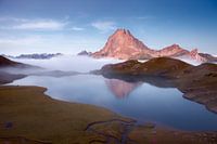 Bergen weerspiegelen in meer bij zonsondergang, Pyreneeën, Frankrijk. Dit is Pic du Midi d'Ossau met reflectie in Lac Gentau. Een prachtig berglandschap met mist in het laatste warme licht van de ondergaande zon.