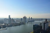Queen Mary 2 meert aan in Rotterdam. Met iconen als de Maastoren, Erasmusbrug, de Rotterdam, het World Port Center, Montevideo en de Maas.