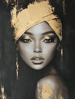 Dit portret straalt kracht en elegantie uit. De vrouw is afgebeeld met een gouden hoofddoek die haar gezicht omhult als een kroon, wat haar uitstraling versterkt. Haar opvallende gouden oorbellen en stralende ogen, die de warmte van de gouden tinten reflecteren, maken haar expressie mysterieus en tegelijk onweerstaanbaar. De donkere achtergrond zorgt ervoor dat zijzelf nog meer opvalt, terwijl de subtiele penseelstreken rond haar hoofd een bijna etherische beweging suggereren. Ze straalt zelfvertrouwen, verfijning en een bijna koninklijke allure uit.