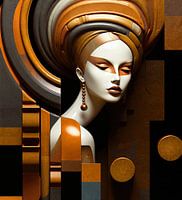 Figuratieve abstractie met het portret van een vrouw en een collage van metalen platen in warme brons,goud en aardetinten.