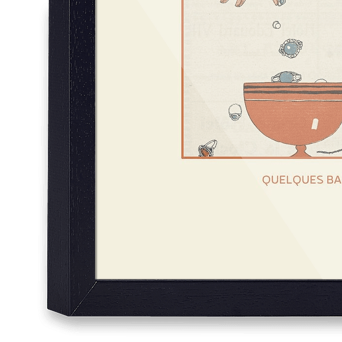 Een historische mode prent in een modern jasje: "Quelques bagues". Geïnspireerd door de art deco, een stijlbeweging die opkwam in de jaren twintig van de vorige eeuw. Nieuw zakelijkheid gemengd met moderne strakke lijnen en kleuren.