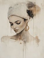 Deze afbeelding toont een serene, abstracte voorstelling van een vrouw met een ingetogen blik en zachte, gedempte kleuren. De gouden oorbel die ze draagt vormt een subtiele maar krachtige focus in het werk, die de ingetogen eenvoud doorbreekt met een vleugje luxe. De penseelstreken zijn licht en vloeiend, wat de compositie een dromerige sfeer geeft. Haar gesloten ogen en delicate gezichtsexpressie stralen kalmte en introspectie uit. Het werk combineert zowel abstracte als figuratieve elementen, en de balans tussen licht en schaduw geeft het een etherische, tijdloze kwaliteit.