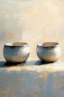 Quiet Reflection - Dit stilleven schilderij toont twee symmetrisch geplaatste ronde kommen op een lichtreflecterende ondergrond, badend in zacht, diffuus licht met een abstracte, warme achtergrond.