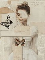Dit kunstwerk toont een subtiel en ingetogen portret van een vrouw omgeven door vlinders en fragmenten van papier. Haar gezicht is gedeeltelijk verborgen achter vintage lijkende tekst, wat een gevoel van mysterie en zachtheid oproept. De combinatie van vlinders en de vervaagde, gescheurde papierlagen symboliseert vergankelijkheid en de breekbaarheid van het leven. Het werk heeft een dromerige, poëtische sfeer, versterkt door de zachte, neutrale kleuren die een gevoel van rust en introspectie uitstralen.