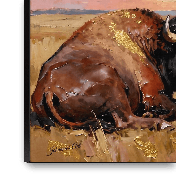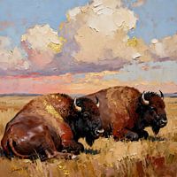 Twee bizons rusten vredig op een weids grasveld, hun massieve vormen geaard en sereen onder een lucht vol levendige, drijvende wolken. De open uitgestrektheid van hun natuurlijke habitat strekt zich uit en nodigt uit tot een gevoel van vrijheid en stille eerbied. Zacht licht overspoelt hun dikke vacht en creëert zachte highlights en…