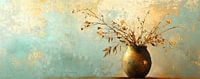 Quiet Vessel - Dit bloemen schilderij is een japandi stilleven dat een grote ronde vaas centraal toont met uitwaaierende dunne takken en kleine gedroogde bloemen, geschilderd met dikke verftextuur en warme gouden accenten tegen een zachte blauw-beige achtergrond, ideaal als bloemen schilderij of schilderij bloemen voor modern interieur…