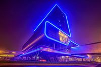 De neonverlichting geeft dit gebouw een bijzondere uitstraling 's avonds.
