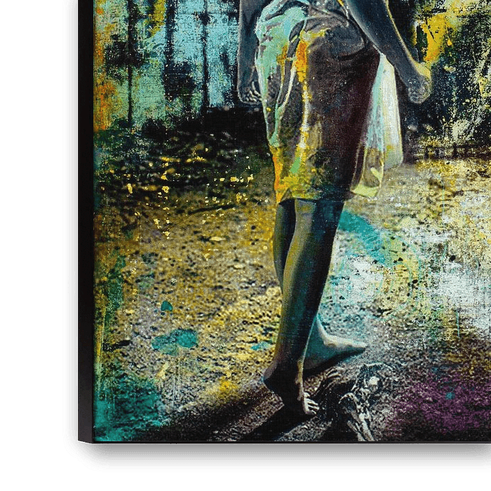 'READY FOR THE NEXT STEP' is een mixed media urban kunstwerk waarin gelaagdheid en textuur een belangrijke rol spelen.