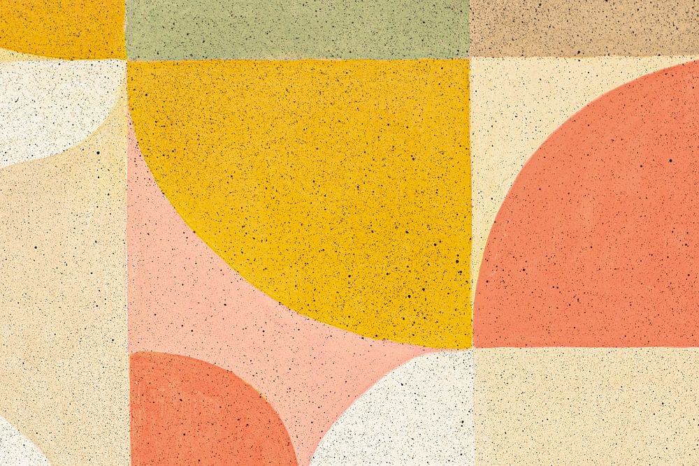 De compositie bestaat uit een spel van overlappende vormen, die diepte en beweging suggereren. De golvende lijnen en subtiele kleurovergangen versterken de associatie met natuurlijke elementen, zoals zandduinen, stromend water en zachte horizonlijnen. Het werk speelt met contrasten: tussen warme aardse nuances en pasteltinten, en tussen de organische vormen en de gestileerde eenvoud van het ontwerp.