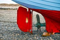 Roer en schroef van een oud visserijschip op de het landen plaats op het strand van de Noordzeekust in Denemarken.