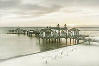 De eerste Sellin-landingsplaats werd al in 1906 ingehuldigd. Na een reconstructie in 1998 glanst de pier nu weer in zijn historische vorm van 1927. De aantrekkelijke constructie van het brughuis in het wit is vandaag de dag een herkenningspunt van de Baltische badplaats in typische kuuroord-architectuur. Idyllische vintage-impressie van de zonsopgang.
