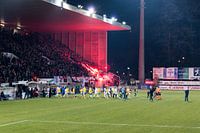 De naam RWDM is een begrip in België. Een naam die voetbal cultuur is en die ontzag inboezemt. Toen de club in 2002 failliet ging, beloofden fanatieke fans een ding: "Wij komen terug". En dat gebeurde in 2015, toen een groep fans zich inzetten om RWDM weer terug te laten keren. De club kent sindsdien een indrukwekkende opmars in het Belgische voetbal en oude tijden herleven weer in het Edmond Machtens Stadion. Het mag met trots gezegd worden: RWDM is weer terug. Op deze foto zie je hoe de teams van RWDM en Royale Union Saint-Gilloise (RUSG) het veld opkomen. Wil je deze foto ook aan de muur? Aarzel niet en bestel hem snel!