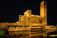 Het beroemde raadhuis van Hilversum ontworpen door architect Willem Marinus Dudok. Mooie weerspiegeling in de raadhuis vijver en een prachtige sterrenhemel.