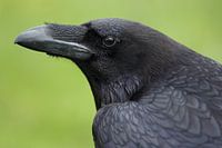 Een portret van een Raaf tegen een groene achtergrond. Deze vogels zijn heel intelligent en natuurlijk prachtig om te zien.