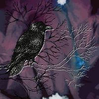 Een pentekening van een raaf, digitaal na bewerkt. De raaf bestaat uit zwarte en witte lijnen. Een witte lijn zorgt dat de raaf uit de achtergrond komt. De achtergrond is een vage paarse abstracte structuur.