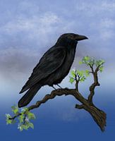 Een digitaal schilderij van een raaf die op een tak zit met groene blaadjes. De achtergrond is meerdere tinten blauw met een wolkenstructuur. Je ziet de vogel van opzij en hij kijkt naar rechts. Je ziet zijn profiel. De raaf is realistisch getekend maar toch tekenachtig, door de vlotte "krijt" strepen op zijn rug om de veren weer te geven. Heel lichtjes is de structuur van echte veren op zijn rus te zien. deze veren zijn afgeleid van een echte foto die is in gescand en vervolgens is daar een penseel van gemaakt in het programma Pro create, een tekenprogramma op de tablet.
